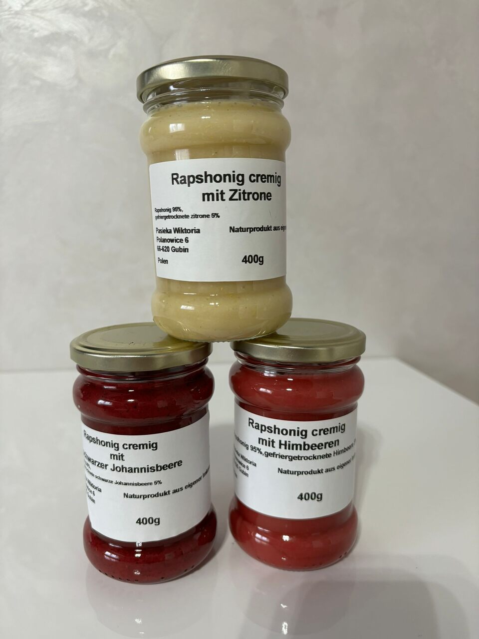 - miód kremowany z maliną, który oferuje słodki i delikatny smak miodu rzepakowego z nutą malin,